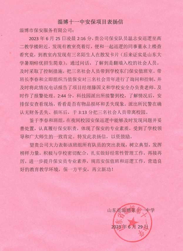 6月29日市保安公司駐淄博市第十一中學(xué)崗點(diǎn)收到學(xué)校送來(lái)的一封感謝信。信中對(duì)保安隊(duì)員溫志安、董永以及班長(zhǎng)李春和項(xiàng)目負(fù)責(zé)人滕國(guó)義提出表?yè)P(yáng)。6月25日凌晨2時(shí)16分,派駐淄博第十一中學(xué)保安隊(duì)員溫志安、董永巡邏至高二教學(xué)樓附近發(fā)現(xiàn)有三名陌生人在散發(fā)卡片(后來(lái)證實(shí)是山東大學(xué)暑期培優(yōu)招生簡(jiǎn)章)。通過(guò)問(wèn)話,了解到是翻墻入校的社會(huì)人員,及時(shí)采取了控制措施,班長(zhǎng)李春和及時(shí)將此情況電話報(bào)告了項(xiàng)目負(fù)責(zé)人滕國(guó)義和學(xué)校安全辦負(fù)責(zé)老師,并及時(shí)作了報(bào)警處理。2時(shí)44分,科技園派出所接警到校,了解情況后,確認(rèn)無(wú)財(cái)物丟失、損壞后,于3時(shí)13分把三名社會(huì)人員帶離校園。為表彰先進(jìn)、弘揚(yáng)正氣,在保安隊(duì)伍中積極營(yíng)造干事創(chuàng)業(yè)、爭(zhēng)先創(chuàng)優(yōu)的良好氛圍,7月11日上午,對(duì)以上四名同志作出相對(duì)應(yīng)的現(xiàn)金獎(jiǎng)勵(lì),十一中校領(lǐng)導(dǎo)和公司項(xiàng)目負(fù)責(zé)人召開(kāi)專(zhuān)題會(huì)議共同為隊(duì)員進(jìn)行了表彰。“平凡崗位,點(diǎn)滴熱忱”李春和班組,在夜間校園安保巡邏中能夠及時(shí)發(fā)現(xiàn)問(wèn)題并妥善處置,認(rèn)真履行保安職責(zé),不僅體現(xiàn)了市保安公司保安隊(duì)員的專(zhuān)業(yè)素質(zhì),而且為其他保安隊(duì)員樹(shù)立了學(xué)習(xí)的榜樣。